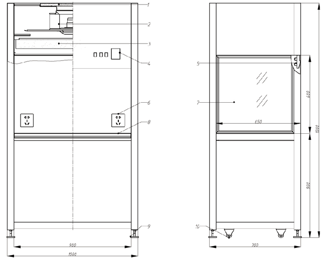 水平流超凈工作臺方案圖標示了各大組成部分的配件名稱,目的是為了讓用戶更清楚的了解水平流超凈工作臺構造。