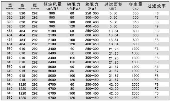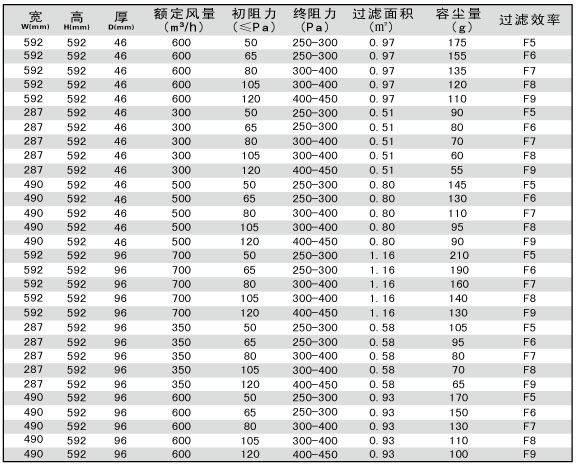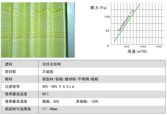 效率:大氣塵比色法平均過濾效率:45%,65%,85%,95